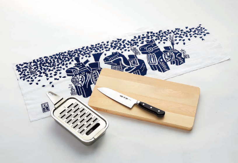 日本橋木屋で人気の切れ味・刃持ちが良い粉末鋼鎌型庖丁・熟練の職人技がさえる箱型純銅本目立ておろし金・干支である「午」の焼印が施された木曽ひのきのまな板・手拭いが入った調理道具のセットです。